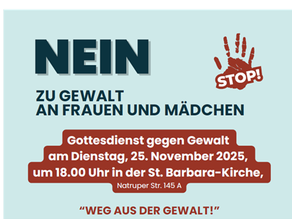Herzlich lädt die kfd der Region Osnabrück zum diesjährigen Gedenkgottesdienst gegen Gewalt an Frauen ein. Dieser findet am Dienstag, den 25. November um 18 Uhr in der Barbarakirche statt.