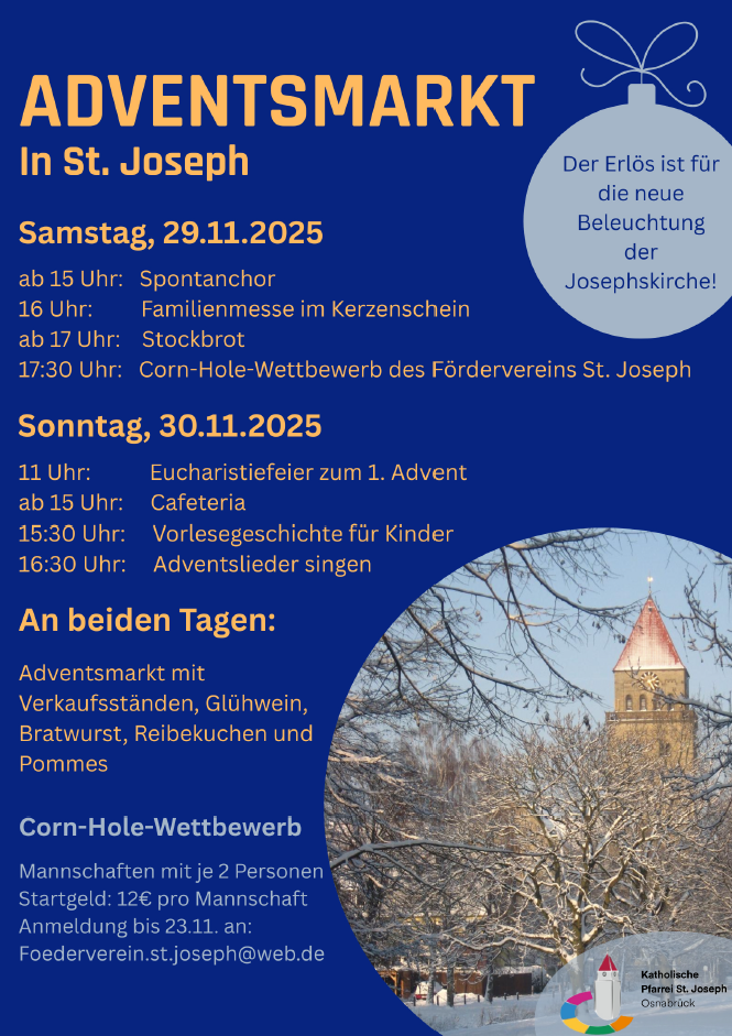 Ab 15 Uhr laden wir zur Cafeteria ins Pfarrheim ein. Um 15:30 Uhr gibt es Vorlesegeschichten für Kinder und ab 16:30 Uhr wollen wir gemeinsam Adventslieder singen.