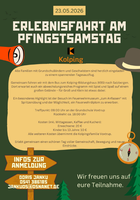 Kosten für Mittagessen, Kaffee und Kuchen im KBS: Erwachsene 20 Euro und Kinder bis 13 Jahre 10 Euro. Alle weiteren Kosten übernimmt die Kolpingsfamilie Voxtrup. Wir freuen uns auf eure Teilnahme.