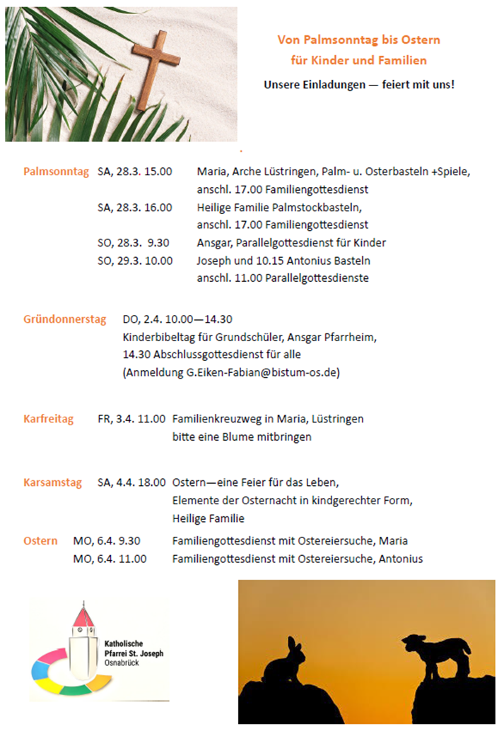 In der Hl. Familie feiern wir am Karsamstag um 18:00 Uhr eine Wort-Gottes-Feier zum Thema „Ostern – Eine Feier für das Leben.“ Dazu sind alle Kinder und deren Familien herzlich eingeladen.