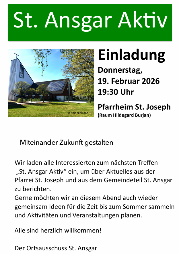 Wir laden alle Interessierten zum nächsten Treffen „St. Ansgar Aktiv“ ein, um über Aktuelles aus der Pfarrei St. Joseph und besonders aus dem Gemeindeteil St. Ansgar zu berichten. Gerne möchten wir an diesem Abend auch wieder gemeinsam Ideen für die Zeit bis zum Sommer sammeln und Aktvitäten und Veranstaltungen planen.