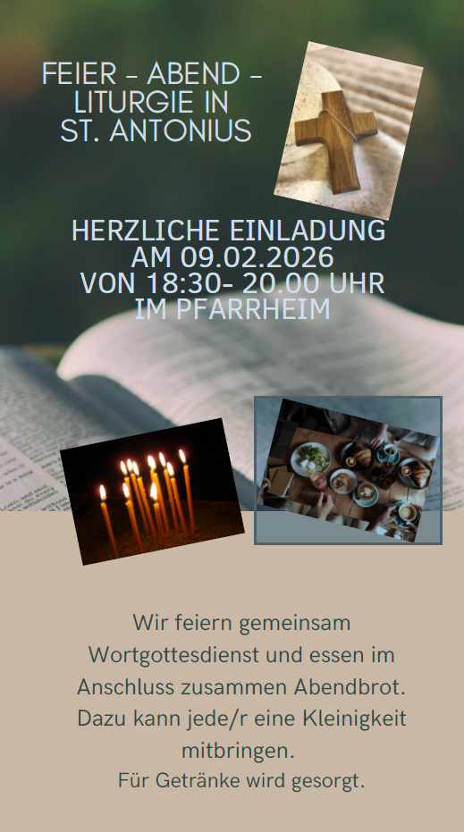 Am Abend des 16.04.2026 um 18:30 Uhr möchten wir mit euch Gott in Wort und Gesang feiern. Wir schließen unsere kleine Feier mit einem gemeinsamen Essen, zu dem wir bitten, eine Kleinigkeit mitzubringen. Für Getränke ist gesorgt.
