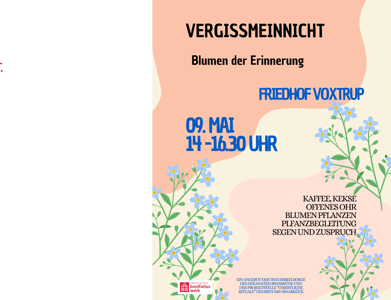 Am Samstag, 9. Mai 2026 bieten wir Euch und Ihnen von 14 - 16:30 Uhr auf dem Friedhof Voxtrup Kaffee, Kekse und ein offenes Ohr an.